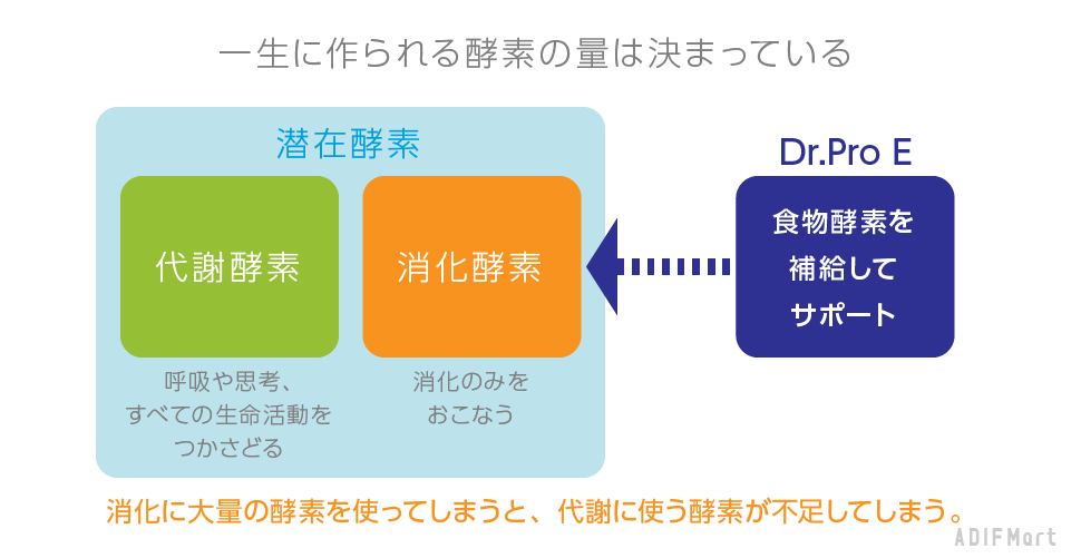 一生に作られる酵素の量は決まっていて、消化に大量の酵素を使うと代謝に使う酵素が不足してしまいます。ドクタープロ・イーは食物酵素を補給して消化をサポートして代謝に使える酵素を確保する手助けをします。